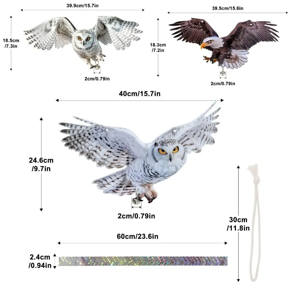 Package Includes: 1 Set Bird Repel(1*Owl /Eagle Pendant,1*Bell,1*Rope,1*Reflective Strips)